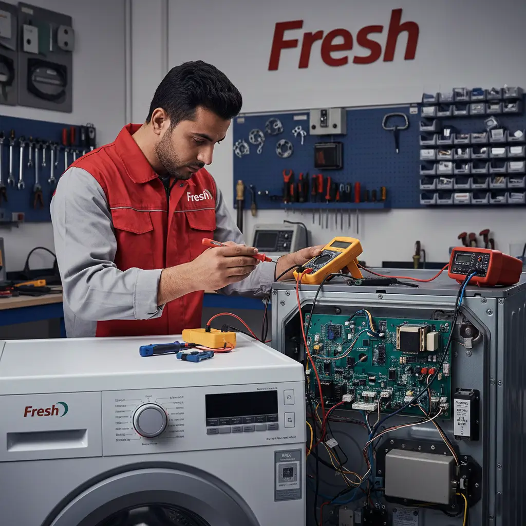 تتميز غسالة أتوماتيك فريش بتقنياتها العالية وبرامجها المتعددة. قد تواجه بعض المشاكل مثل توقف الغسالة عن العصر أو عدم سحب المياه. هنا يأتي دور فنيي صيانة فريش لفحص اللوحة الإلكترونية (PCB)، وطلمبات الطرد، وحساسات مستوى المياه لضمان عودة الغسالة للعمل بكفاءة المصنع.