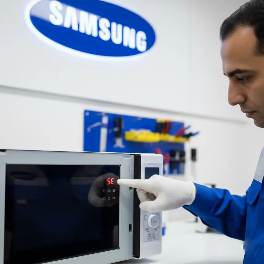 كود (SE) أو (5E): يشير غالباً إلى خطأ في لوحة المفاتيح (Keypad Error)، ربما بسبب زر عالق أو رطوبة، ويتطلب فحص مركز صيانة ميكروويف سامسونج.