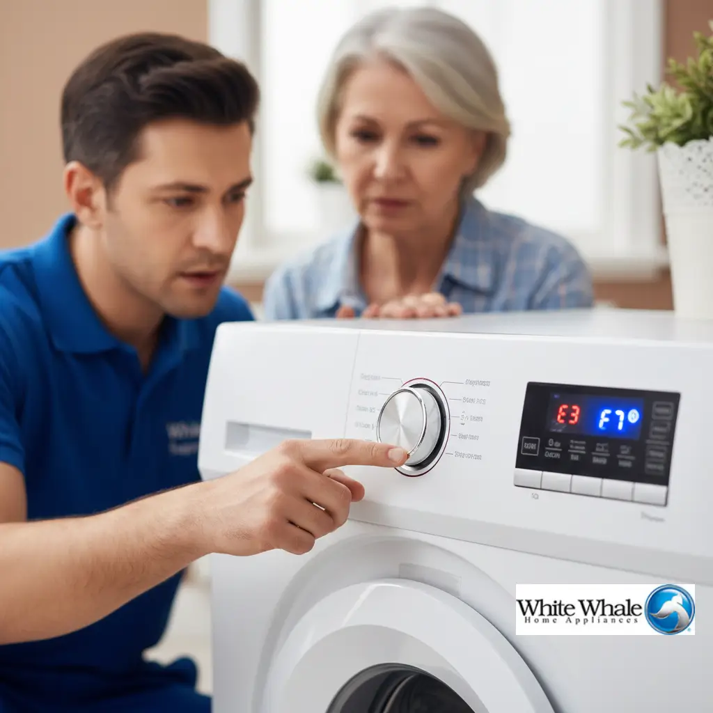 جواب: قُمْ بفصل التيار الكهربائي لمدة 10 دقائق ثم أعد تشغيلها (إعادة ضبط المصنع). إذا استمر الرمز، فهذا عطل حقيقي يَسْتَلْزِمُ زيارة فني صيانة غسالات وايت ويل.